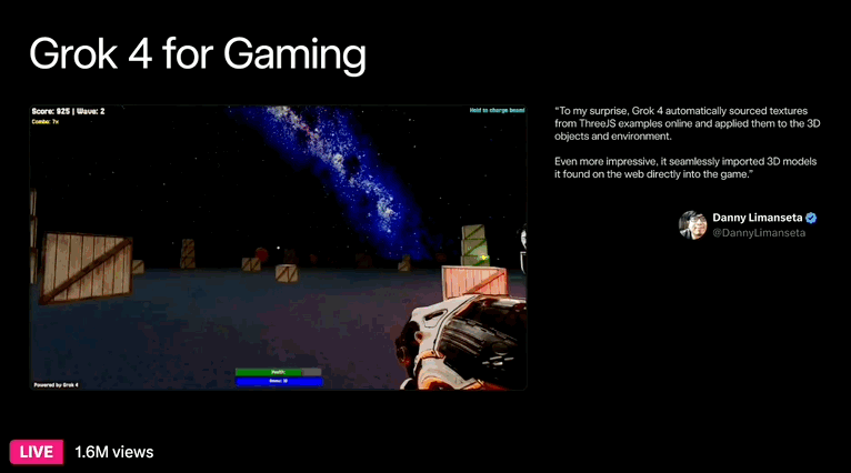 最后是游戏体验,DannyLimanseta 在 4 小时内用 Grok 4 制作了一款 FPS 射击游戏,Grok 不仅可以用于制作游戏,还能实际运行游戏,洞察优秀游戏的要素并提出改进建议。看着效果真的挺不错。