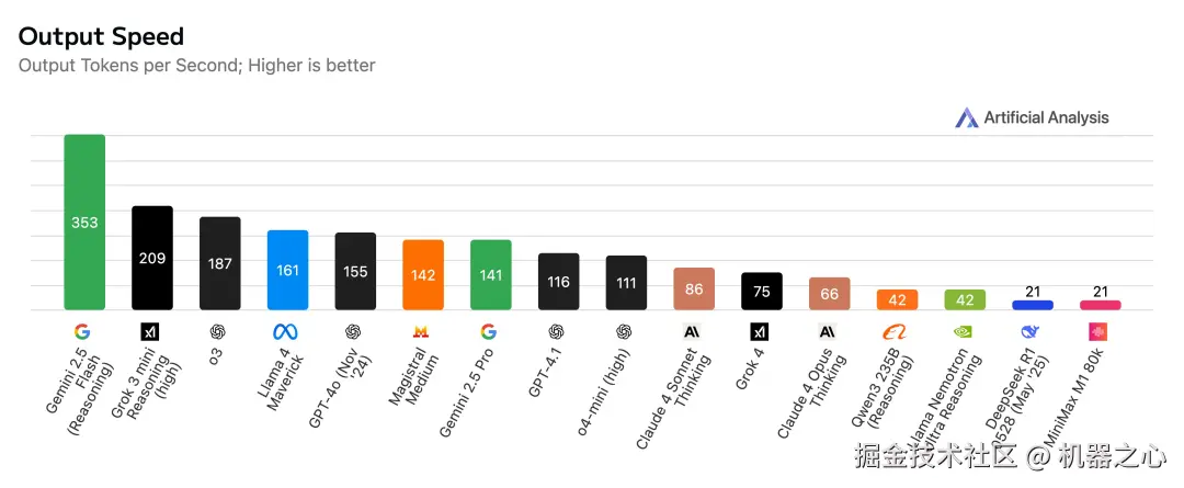 根据 Artificial Analysis 的测试,xAI 的 API 当前以每秒 75 个 token 的速度提供 Grok 4 服务,速度虽不及 o3(每秒 188 个 token),但优于 Claude 4 Opus Thinking(每秒 66 个 token)。