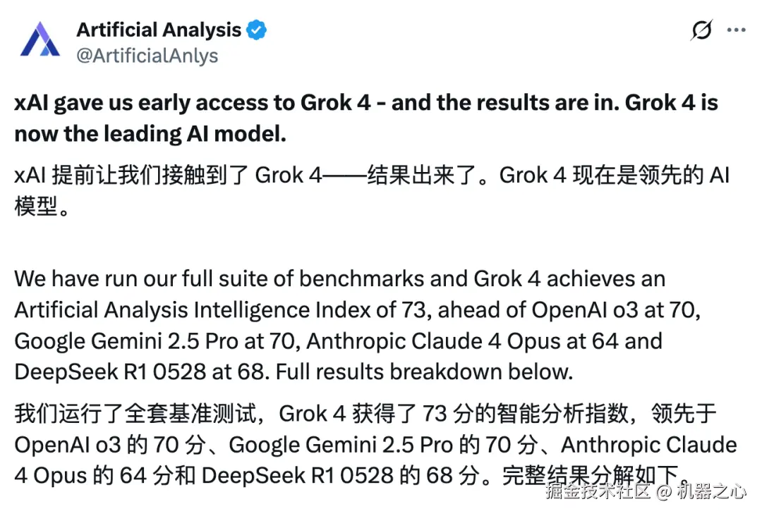 大模型性能评估平台 Artificial Analysis 的全套基准测试成绩表明,Grok 4 已经成为当前领先的 AI 模型,总成绩达到了 73 分,领先于 o3、Gemini 2.5 Pro、Claude 4 Opus、DeepSeek R1 0528。
