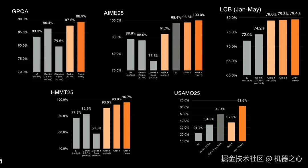 关于其他更多基准测试结果,包括 GPQA(研究生级别的 Google 验证问答基准测试)、AIME25(美国数学竞赛邀请赛)、LCB(Jan-May)(编程竞赛 / 在线算法竞赛)、HMMT25(高中生团队数学竞赛)和 USAMO25(美国顶级高中生数学竞赛)。从下图可以看到,Grok 4 Heavy 均取得了最新 SOTA。