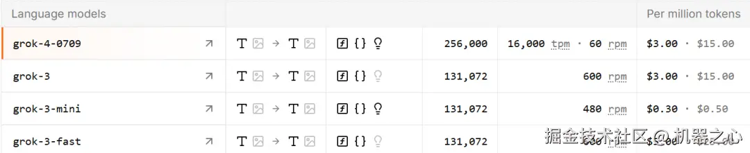 Grok 4 可通过 API 调用,提供 256K tokens 的上下文窗口。目前已经开放使用,版本号为 grok-4-0709,价格与 Grok 3 相同。