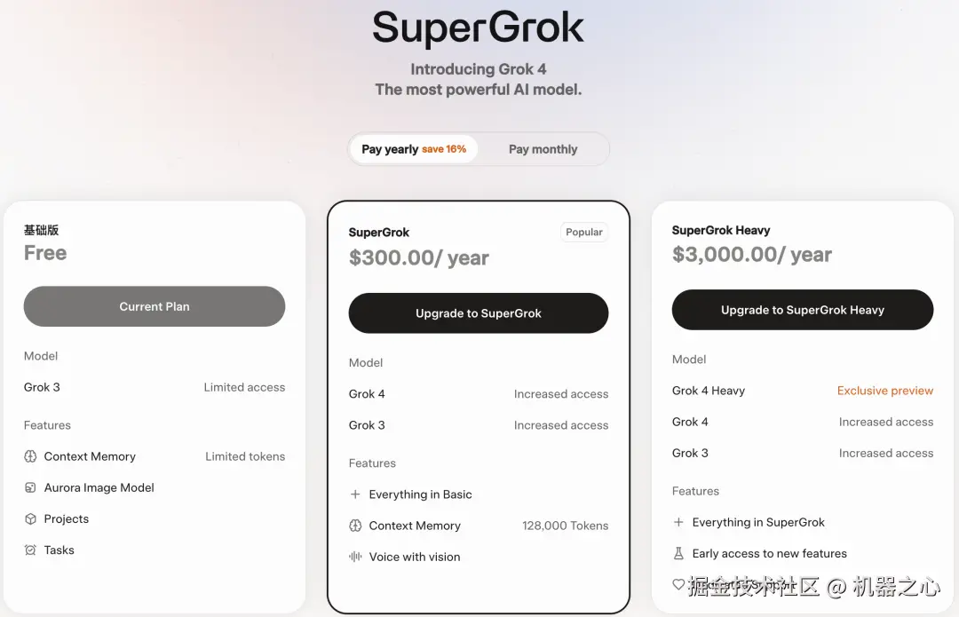 目前,Grok 4 已经上线,不过需要付费使用,而且价格相当昂贵。其付费模式分为年付和月付两种,其中 SuperGrok 是每年 300 美元(折合人民币约 2154 元),SuperGrok Heavey 则是每年 3000 美元(折合人民币 21540 元)。