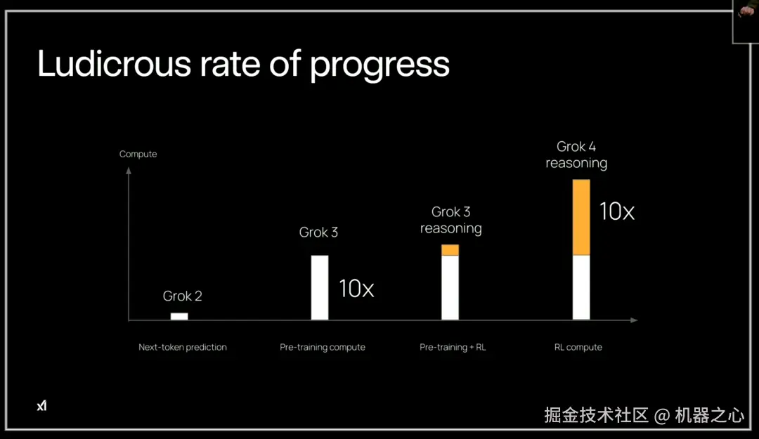 其中,Grok 2 到 Grok 3 预训练阶段的计算量提升了 10 倍,Grok 3 reasoning 首次引入了 RL 微调,带来了深度推理能力。Grok 4 reasoning 的强化学习再度提升了 10 倍的计算量,这意味着显著的推理能力提升。