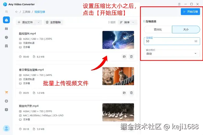 操作步骤:进入Any Video Converter首页,然后点击【工具箱】,点击【视频压缩】,上传文件之后,点击修改【压缩选项】并点击确认【开始压缩】。