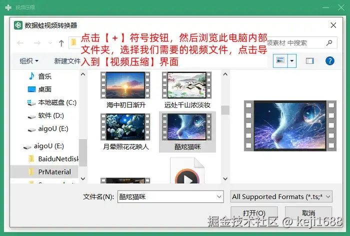 步骤2:点击【+】形状的符号按钮,然后选择我们所需要的视频文件,点击【打开】按钮,将其导入到【视频压缩】的操作界面中。