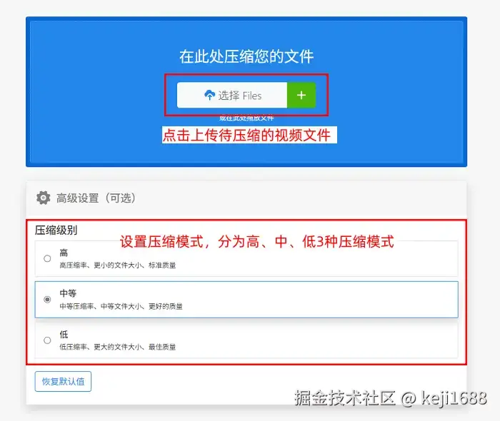 操作步骤:点击进入Zamzar网站的主页,点击【Video Compressions——Compress MP4 file】按钮,然后点击【选择Files】上传我们的视频文件,选择压缩模式,分为高、中、低3种压缩模式,点击【立即压缩】。