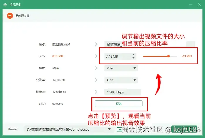 步骤3:点击【预览】按钮,对我们当前视频的视听效果进行预览,然后调节输出文件的大小和压缩比,推荐的输出文件大小是源视频大小的一半左右,推荐的压缩比为40%-60%。