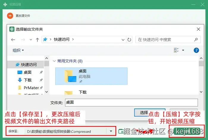 步骤4:如果你需要更改输出文件路径的话,请点击【保存至】,然后点击【与源文件夹一致】即可在视频素材的源文件夹下找到压缩完成之后的视频文件,或者也可以点击【浏览并选择文件夹】,自行调节输出文件地址,比如桌面等文件夹。最后,点击【压缩】样式按钮。