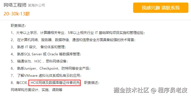 我们来看一看相关职位的招聘要求,很多职位要求都明确标明有HCIP、HCIE优先录用