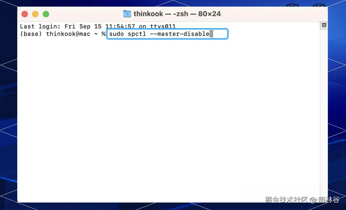 接着,在终端窗口中输入以下命令:sudo spctl --master-disable。输入完毕后,按下回车键执行该命令,系统会要求你输入密码进行确认。