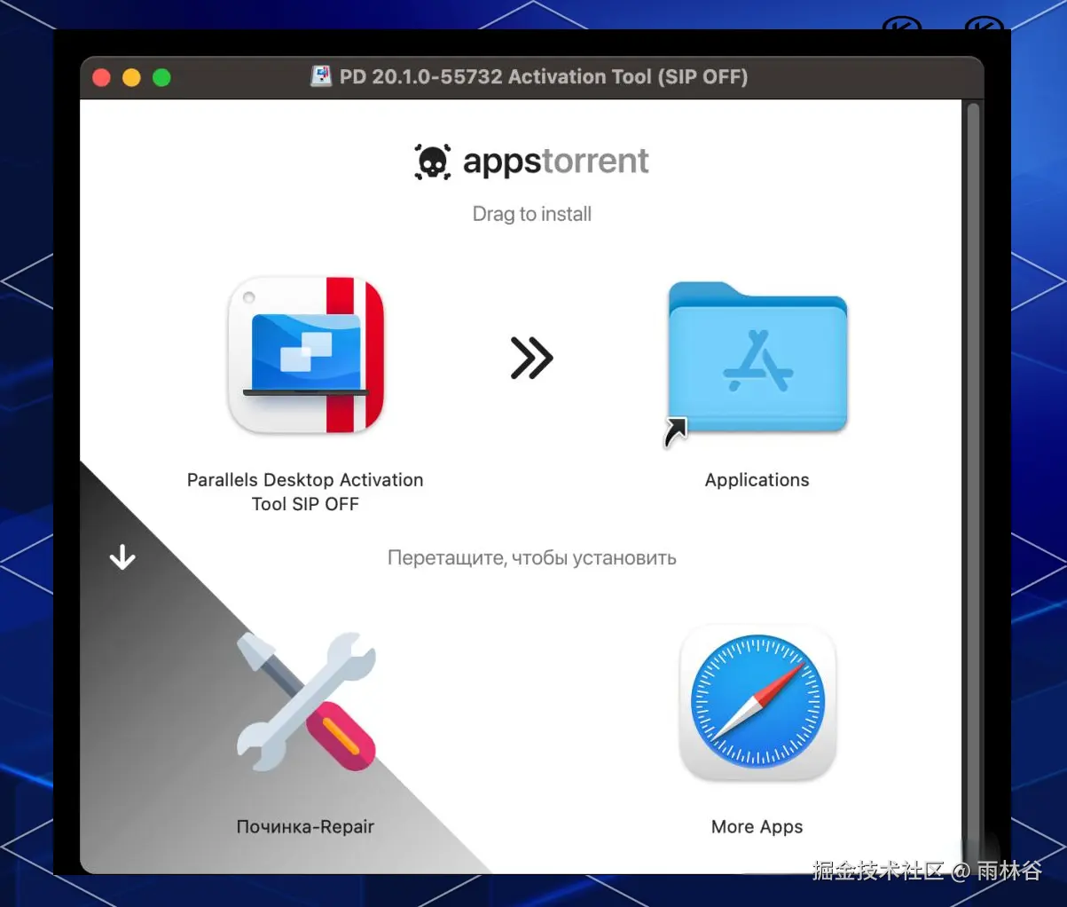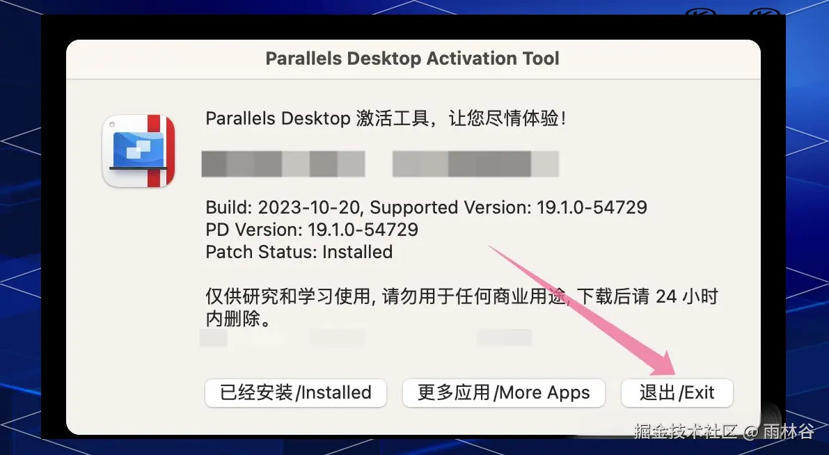 本教程旨在为个人学习和研究提供帮助,仅限于 PD V20.1.0 版本。请注意,其他版本的 Parallels Desktop 可能并不适用本教程,其他渠道下载的安装包可能无法适用本激活教程。