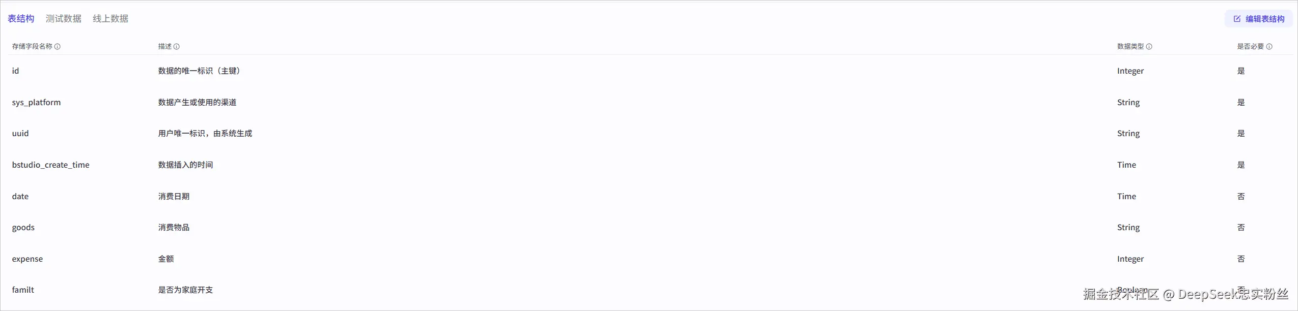 扣子支持在 Prompt 通过 NL2SQL 方式对数据表进行操作。为了方便演示和介绍数据功能,本文以一个记录日常开支的智能体为例。这个智能体中使用的数据表结构如下。