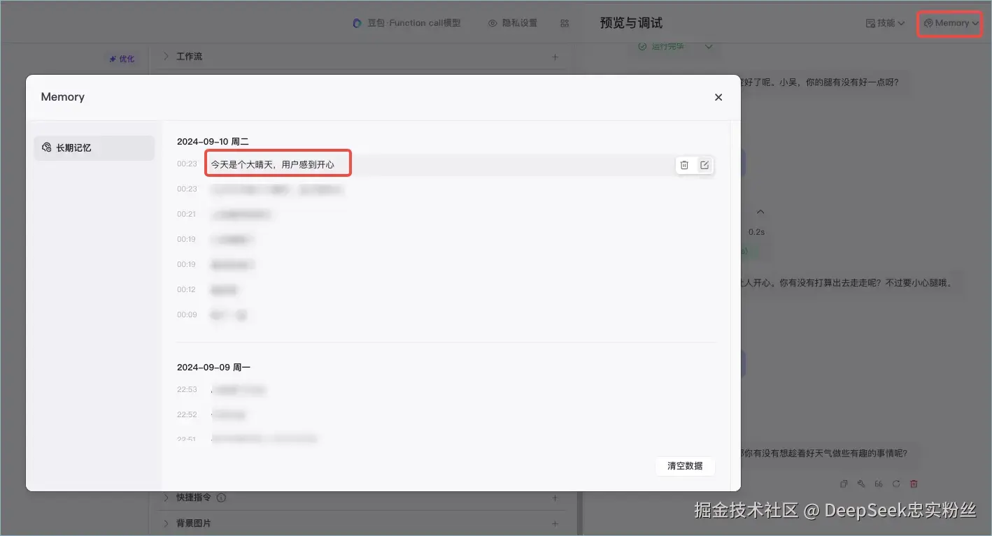 例如,通过对话方式告诉智能体今天的天气,智能体会自动将其记录在长期记忆中。