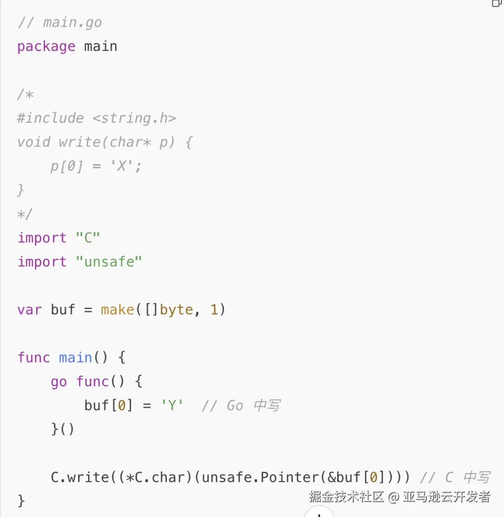 代码中尽管 buf[0] 同时被 Go 和 C 写,这显然是个数据竞争,但是如果针对这段代码运行 go run -race main.go 可能不会报错,原因是 Go 的 race detector 无法检测 C.write() 中的写入行为。在这种场景下我们建议: