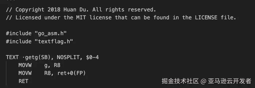 - 这段代码定义了一个名为 getg 的函数,旨在将 goroutine 内存地址 copy 到 R8 寄存器并赋值给函数返回值,并由 pointer 类型接收,从而在代码中作为识别 goroutine 的变量。