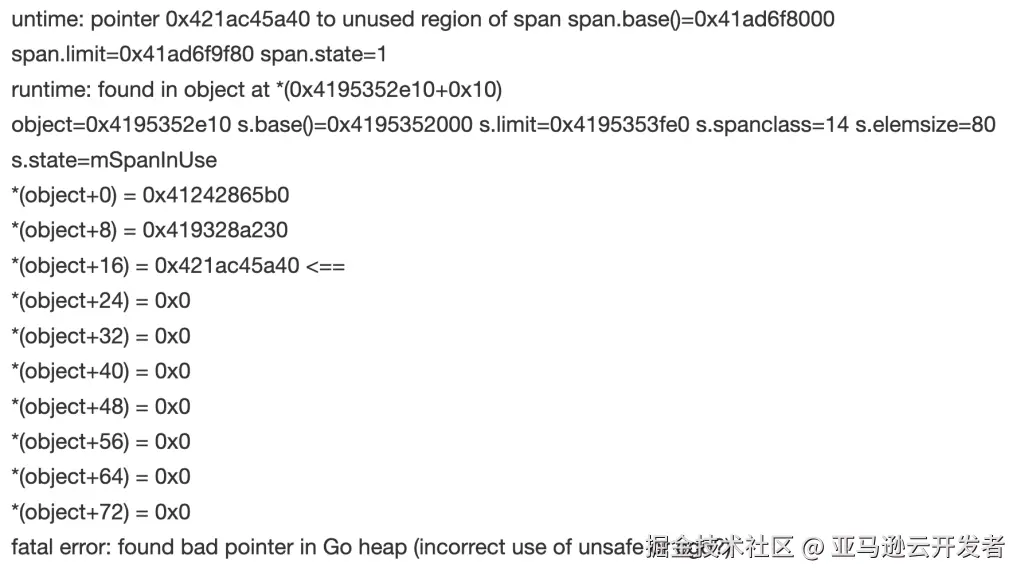 - 但用户使用这个代码时忽略了一个关键问题:MOVW 指令在 64 位机器上会导致地址被截断为 32 位,而程序运行早期 Goroutine 分配多集中于低地址,32 位截断不会造成明显影响;随着高地址分配增多,截断后指针成为悬空指针;最终 GC 标记阶段识别到“指向非分区内存”的指针,报 found bad pointer in Go heap。
