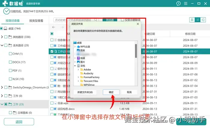 步骤3: 点击文件确认导出后,还需要在小弹窗中选择恢复文件合适的存放位置。