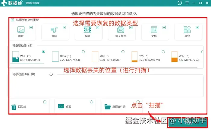 步骤1: 通过在注册页上点击“免费试用” ,新用户也能体验数据 蛙恢复专家强大的扫描能力。在软件的首页,我们跟着提示可以选择自己需要恢复的数据类型,再选择文件丢失的位置,让软件开始进行扫描.