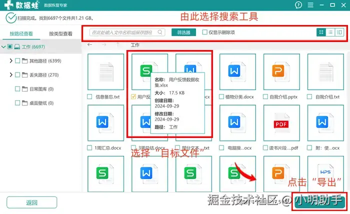 备注:在软件中选择目标文件时,可以使用“筛选器”“搜索框”等等搜索工具,将目标文件直接精准定位。