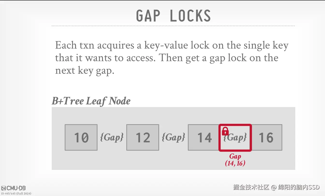 对于索引锁定, 可以是键值锁, 锁管理器会记录这个B+树的特定范围内的某个键值锁。