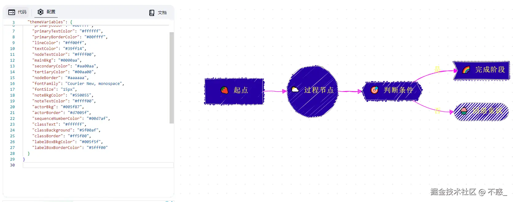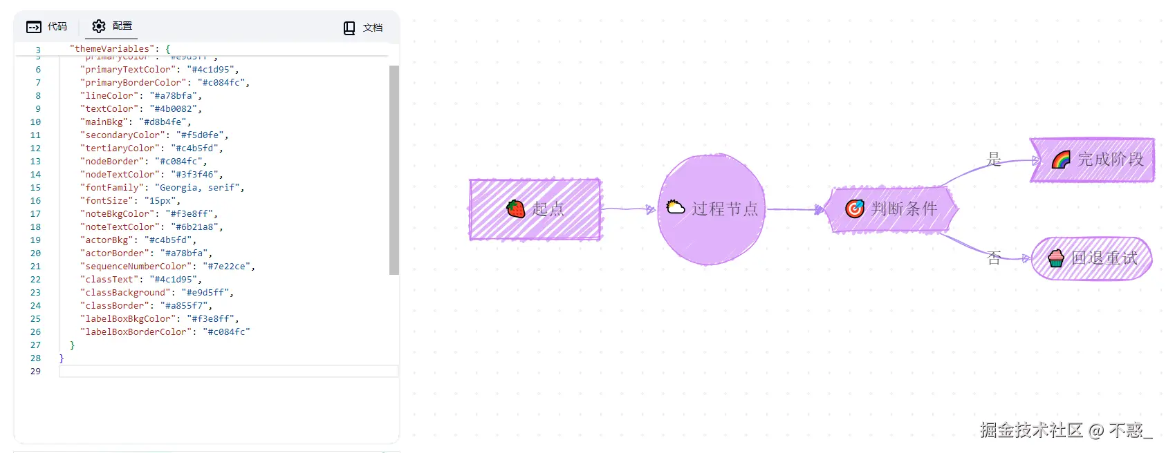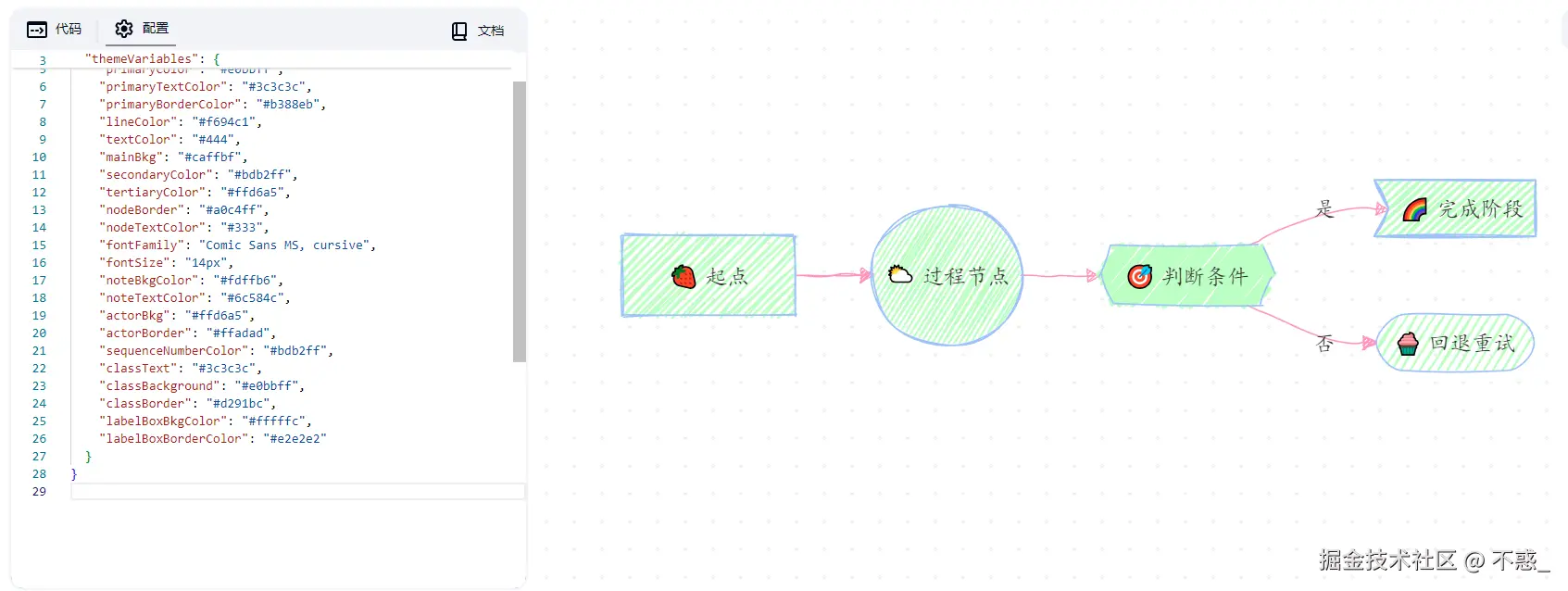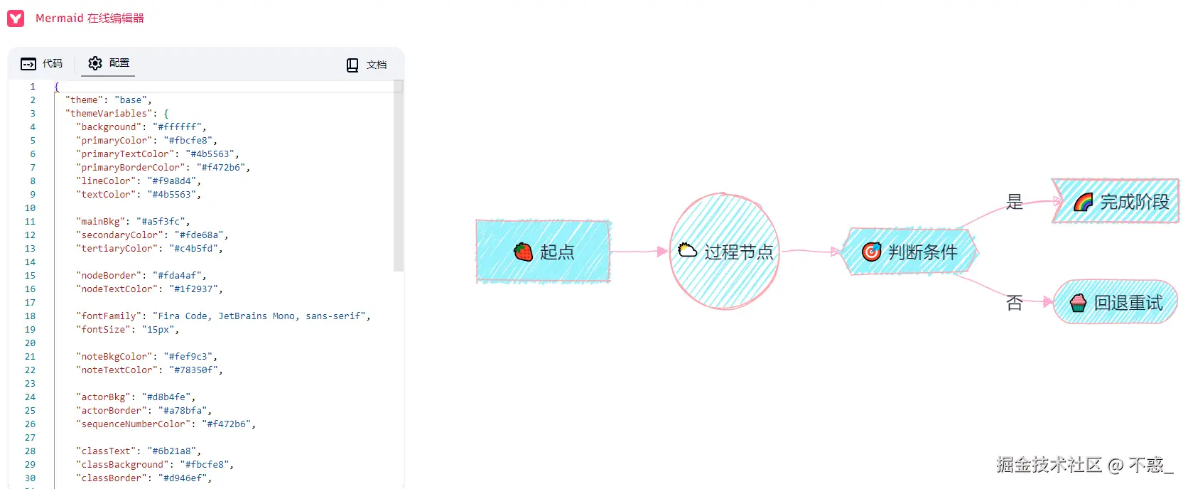 这套主题基于 Mermaid 的 themeVariables,通过调整背景、文字、边框和节点颜色,营造出典型的糖果色彩氛围。