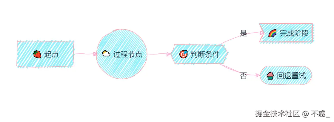[]方形,适合常规步骤,配上浅粉色背景,甜美又醒目。()圆角节点,像气泡糖般柔和,适合中间环节。{{}}菱形判断节点,带有果冻感的渐变色,强调逻辑分支。>右尖角卡片,增强重点或完成状态的视觉感。