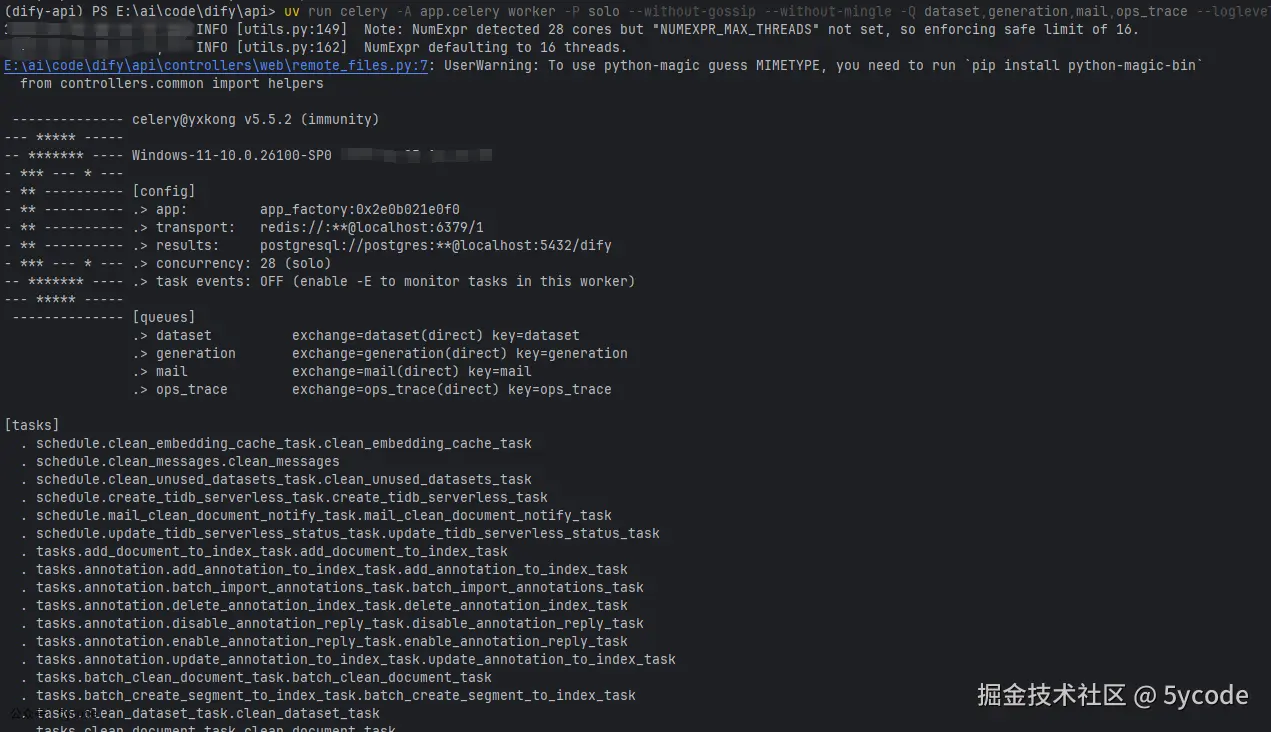 uv run celery -A app.celery worker -P gevent -c 1 --loglevel INFO -Q dataset,generation,mail,ops_trace