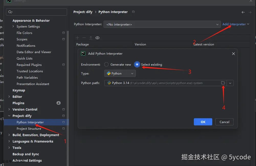 - 选择dify的项目的Python Interpreter