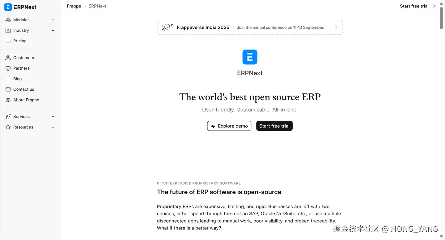 ERPNext 是基于 Frappe 框架构建的开源 ERP 系统,使用 Python 语言开发,采用 Web 架构,前后端分离,功能覆盖广泛。其主要特点包括: