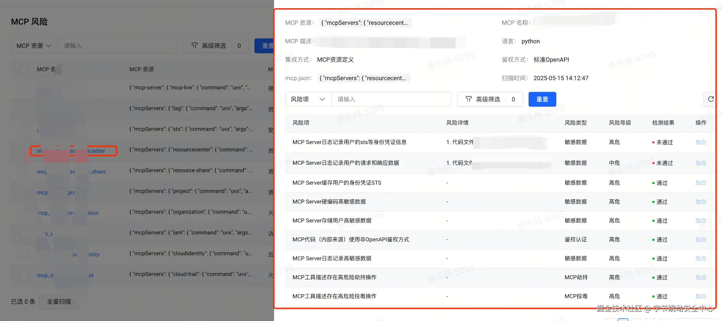 安全准入控制:确保上线到MCP Hub中的MCP Server均经过安全扫描,可覆盖5.2中七类核心安全风险,完成高危严重漏洞修复后方可上线到MCP Server Hub。