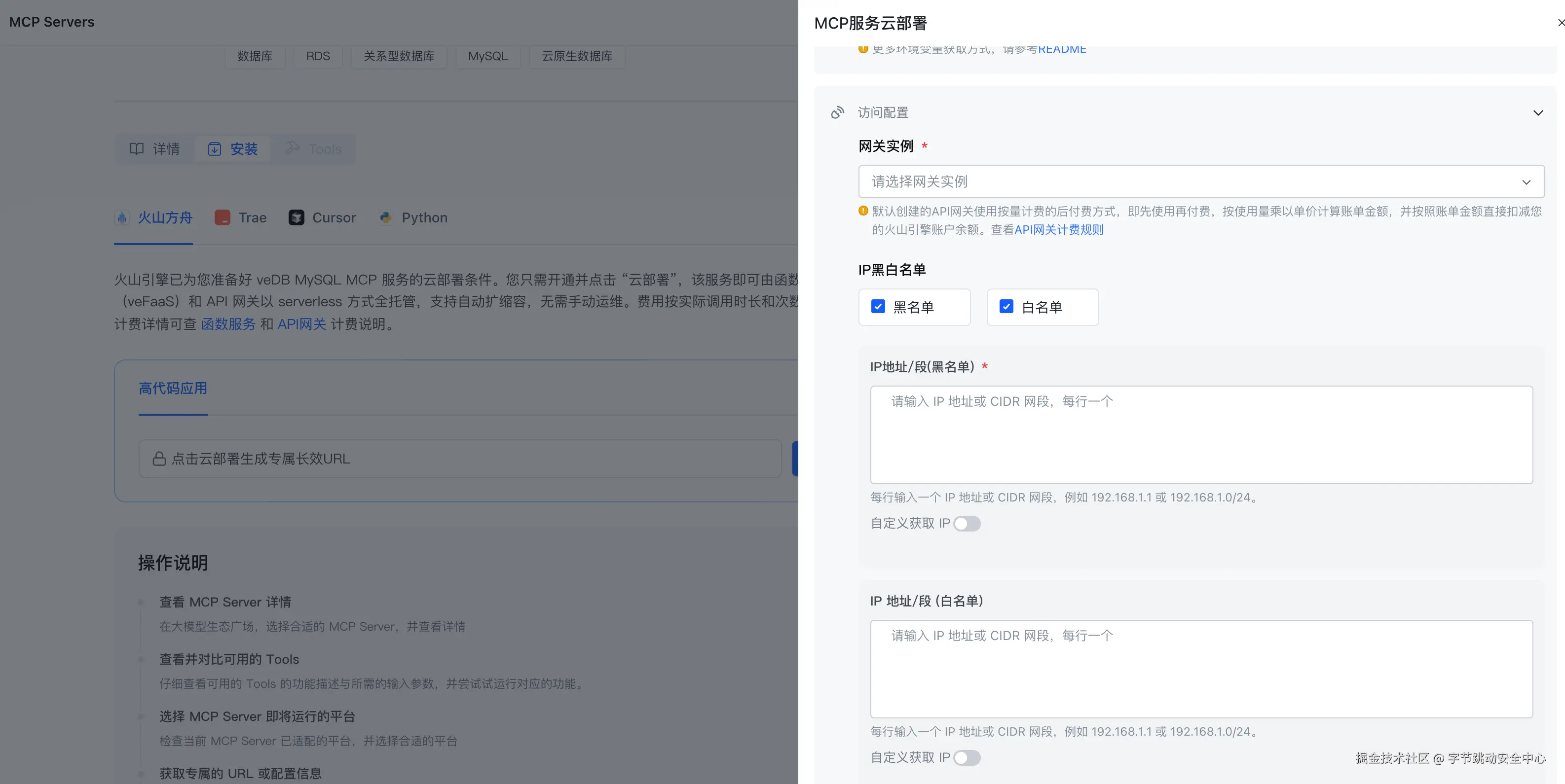 - 禁止高危操作:对火山一方的MCP Server我们对提供的工具能力进行严格审查,默认禁止高危控制面操作,以避免出现非预期的删改操作。