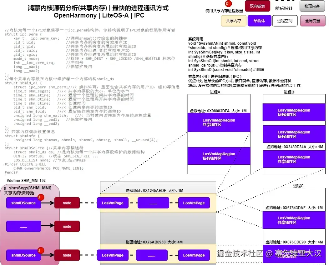 node双向链表上挂的是一个个的物理页框VmPage,这是核心属性,数据将被存在这一个个物理页框中。ShmAllocSeg为具体的分配函数