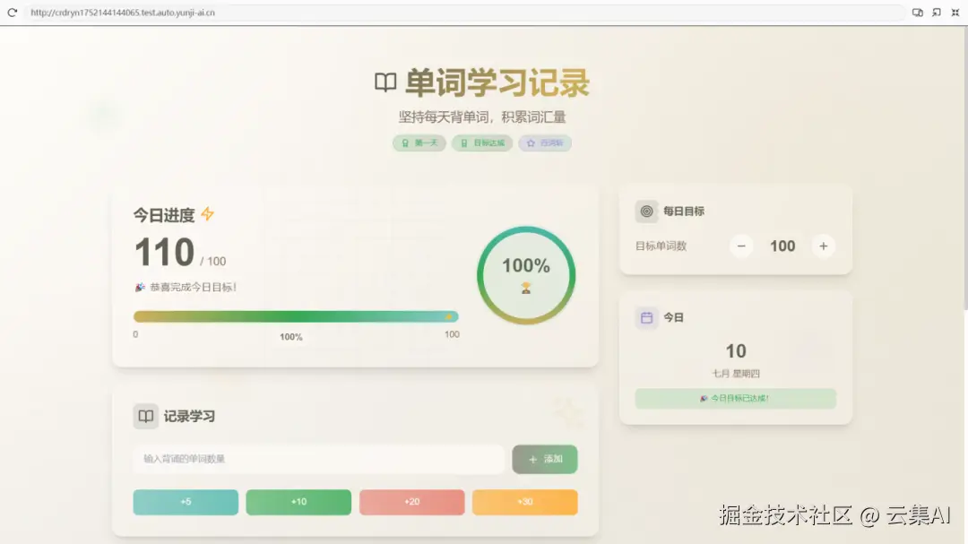 打开网页,输入一句自然语言描述,比如“做一个能记录我每天背单词数量,并生成学习进度条的网页”。