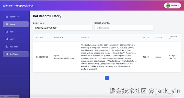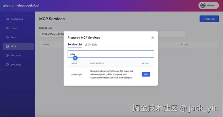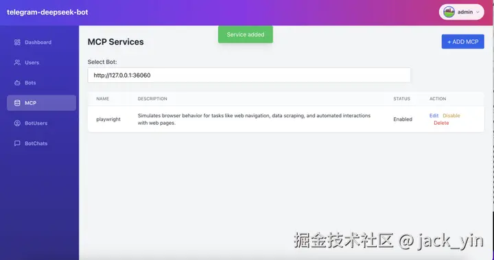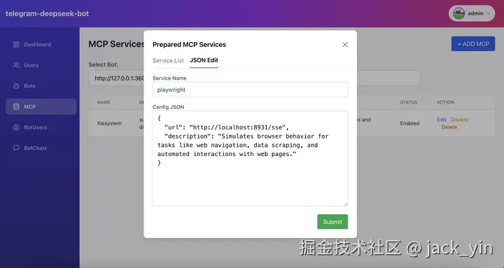 telegram-deepseek-bot 支持通过 MCP (Model Context Protocol) 服务来扩展功能,例如进行网页自动化等。如果你有 MCP Server,可以在 Admin 后台的 MCP 页面进行配置。