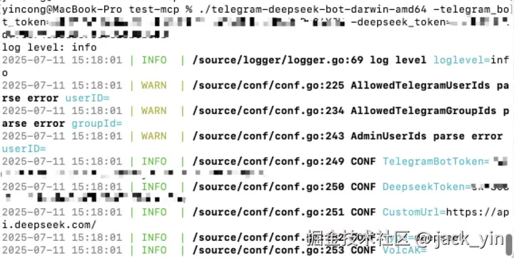 解压下载的文件,然后运行可执行文件。在启动时,你需要提供你的 Telegram Bot Token 和 DeepSeek Token。
