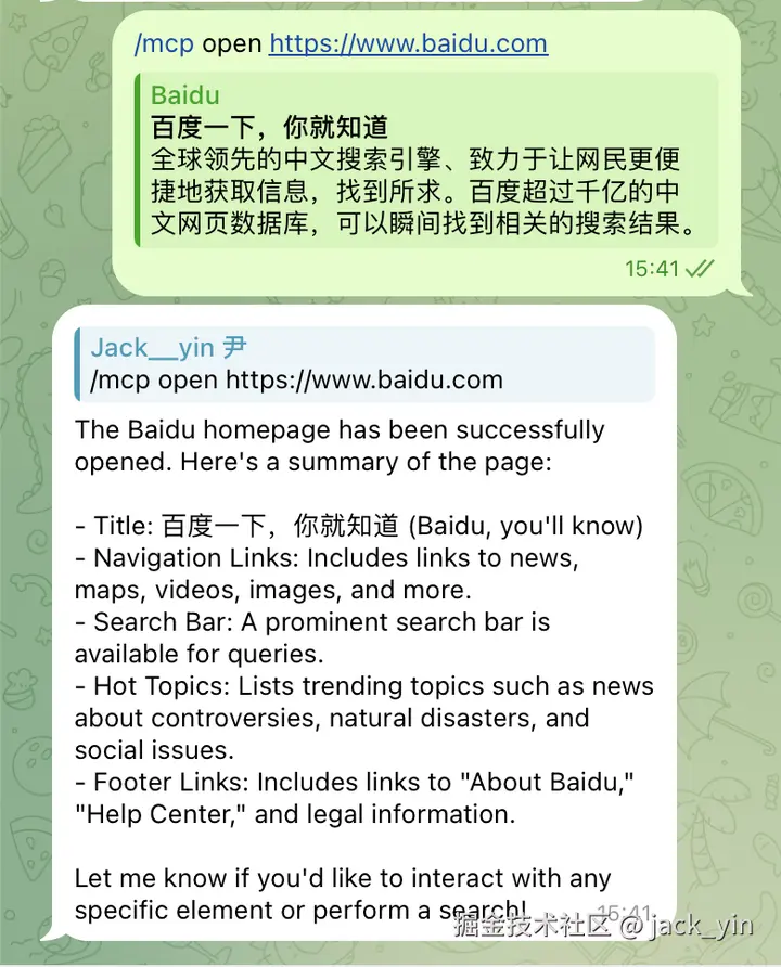 现在,所有配置都已完成,你可以打开 Telegram,找到你的机器人,并开始与它对话了!