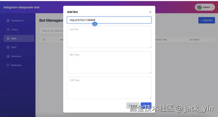 在 Admin 页面中,找到“添加机器人”或类似的选项。在这里输入你的机器人地址信息等。