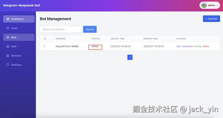 添加完成后,如果一切正常,你的机器人状态会显示为 Online。这意味着 Bot 已经成功与 Admin 后台连接并准备好接收指令。