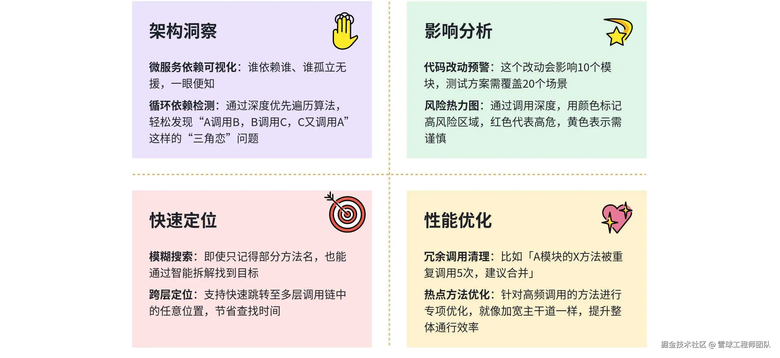 现在,我们已经拥有了一张既清晰又高效的“城市地图”。但这还不是终点,它的真正价值在于能为代码治理带来哪些实质性改变。AST调用链之所以被称为代码界的“城市规划师”,是因为它具备四大核心能力。它可以帮助我们看清楚整个系统的架构脉络,就像查看地铁线路图一样直观;它就像一个智能导航系统,提前告诉你可能的影响范围;它提供了强大的搜索能力;它还能充当“城市建设工程师”的角色,帮助我们识别并优化性能瓶颈。