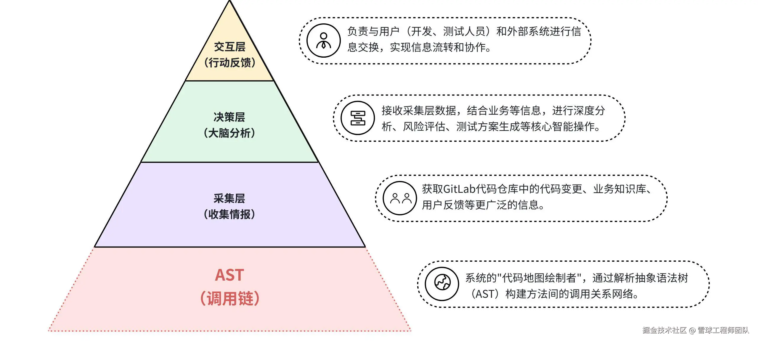 要实现这种“提前预警、全局洞察”的能力,仅靠单一模块是远远不够的。我们需要的是一个结构清晰、分工明确、高度协同的系统架构。这个架构不仅需要强大的AI分析能力作为核心驱动,还需要AST调用链作为上下文感知的桥梁,同时结合采集层、交互层等关键组件,形成一个闭环运作的质量防线。