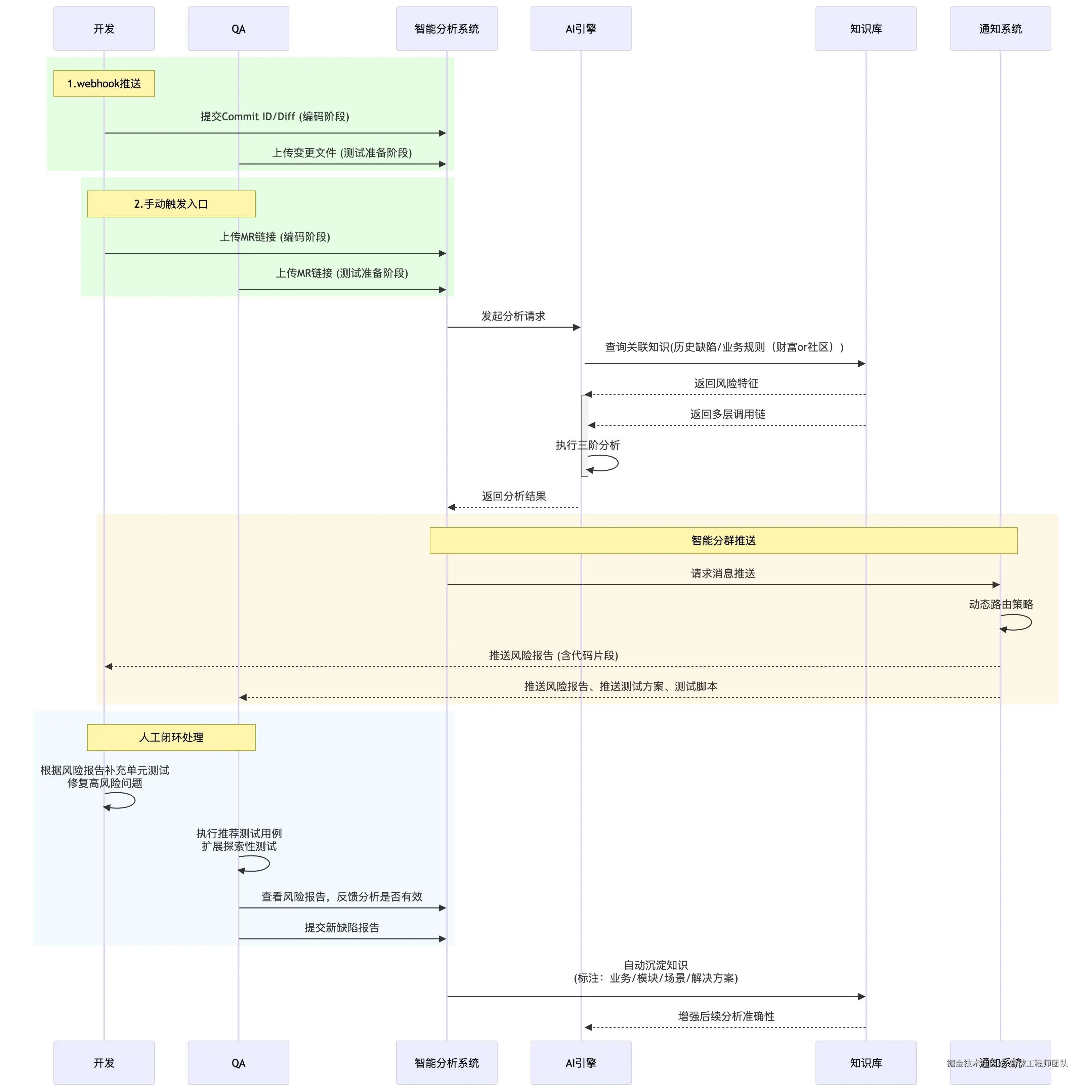 有了这套分层清晰、职责分明的架构设计,系统就可以开始实际运行了。那它是如何一步步识别风险、生成测试方案,并最终推送给开发人员的呢?这就要看我们的核心工作流程——它串联起了从代码提交到风险反馈的每一个关键环节。