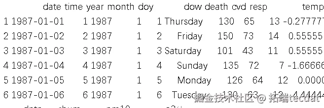我们用的是某城市的空气污染与健康数据,包含日期、死亡数、PM10浓度、温度等信息。加载数据后,用head()函数看看前6行,能快速了解数据结构: