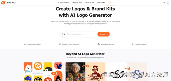 Sologo AI 是一款可以快速生成 Logo 的在线设计工具,免费在线生成,只要你能想到的,输入品牌名称、图像、创意等,就能快速生成超多 Logo 选项,生成的 Logo 还都无水印,版权也归你,可以放心用在商业场景。