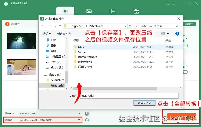 步骤3:点击【保存至】,下拉列表之中,请点击【浏览并选择文件夹】,接下来电脑内部所有文件夹以及你的电脑所外接的U盘的文件夹都可以为你所用,你可以选择一个方便之后使用的文件夹作为输出目录。