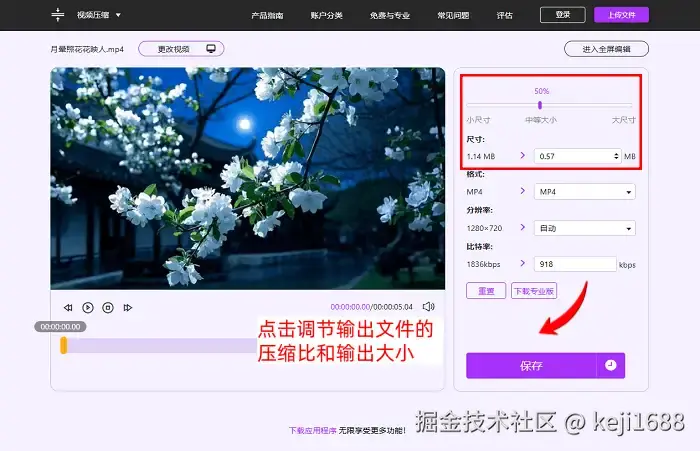操作步骤:点击进入该网站,然后上传我们将要压缩的视频文件,点击调节输出视频文件的尺寸和压缩率,最后点击【保存】。