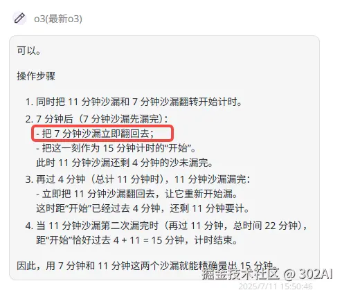 o3:答案存在瑕疵,比如按照所提供的解析,“把7分钟的沙漏立刻翻回去”这一动作没意义。