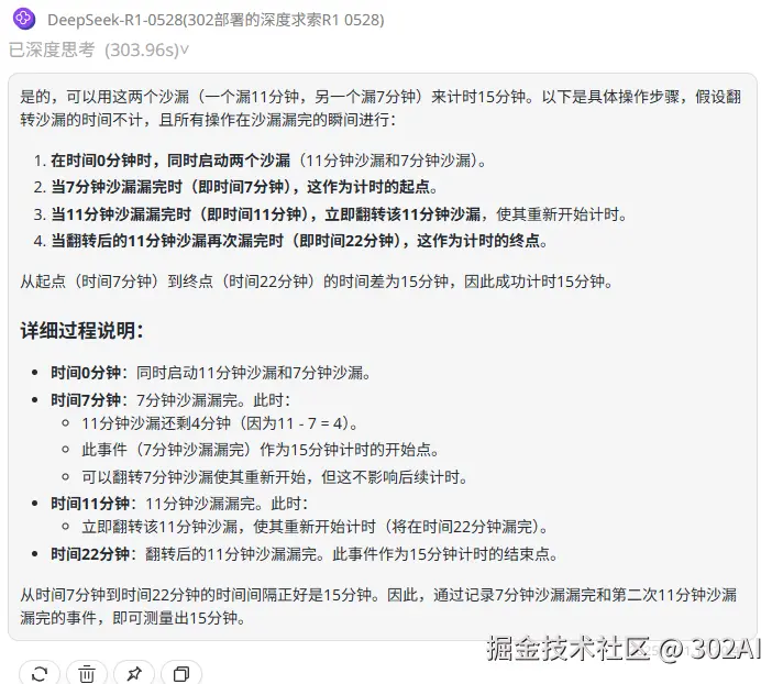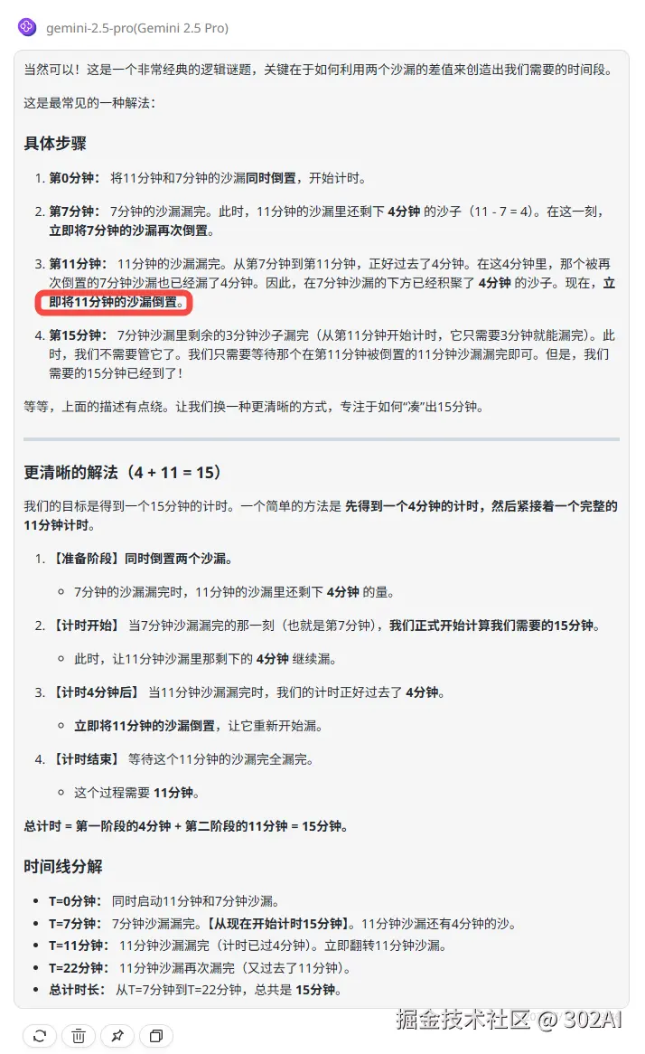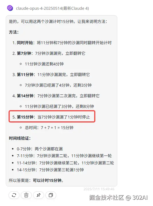 Claude-opus-4:答案不合理,按照所解析的方法需要借助其他工具才能精准控制7分钟的沙漏漏了一分钟,所以答案并不正确。
