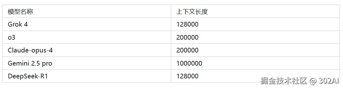 各模型所支持的上下文长度一览表: