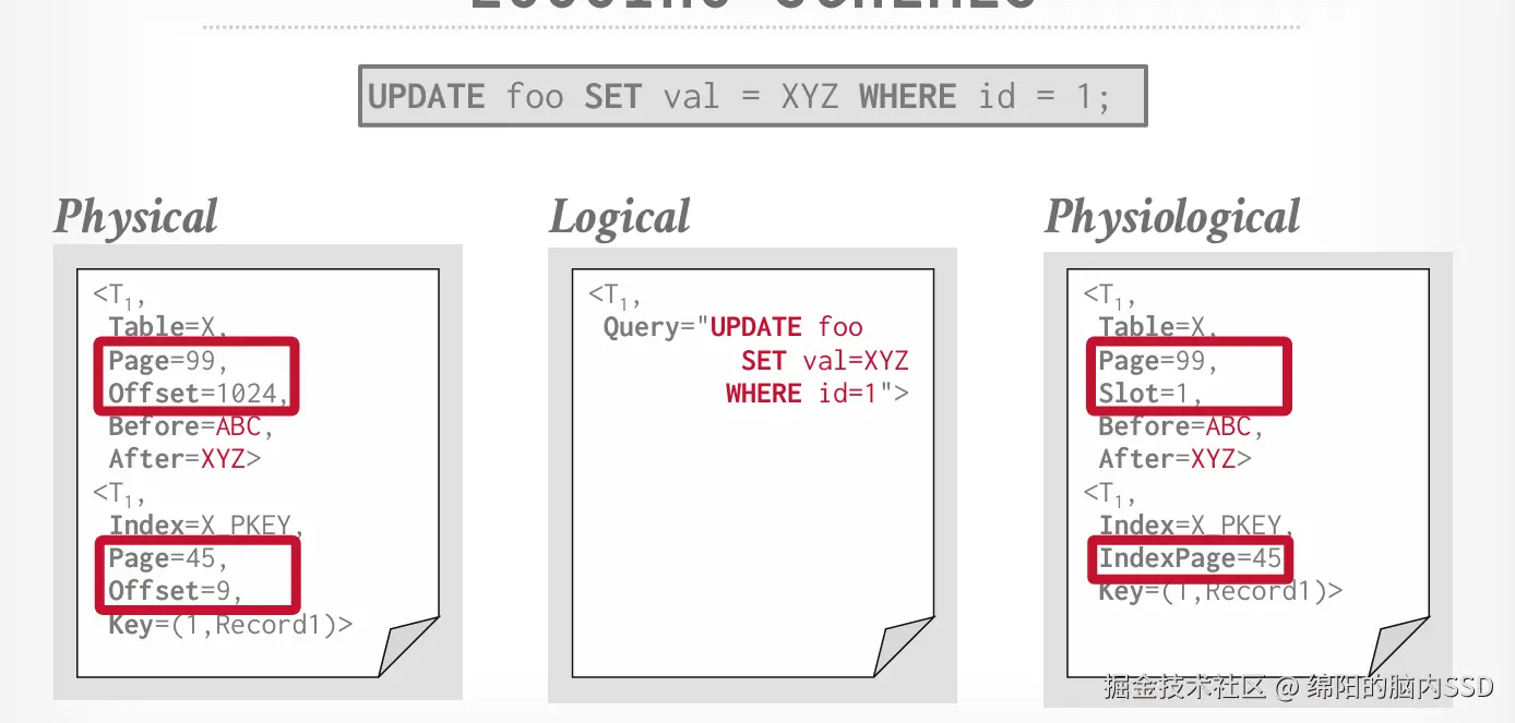 Physical记录了Page也好, Offset具体偏移量; Logical记录了整个sql; Physiological记录了Page页号, Slot则记录了槽号。
