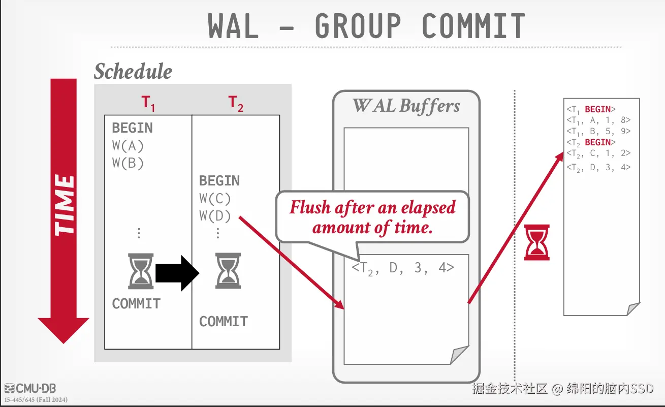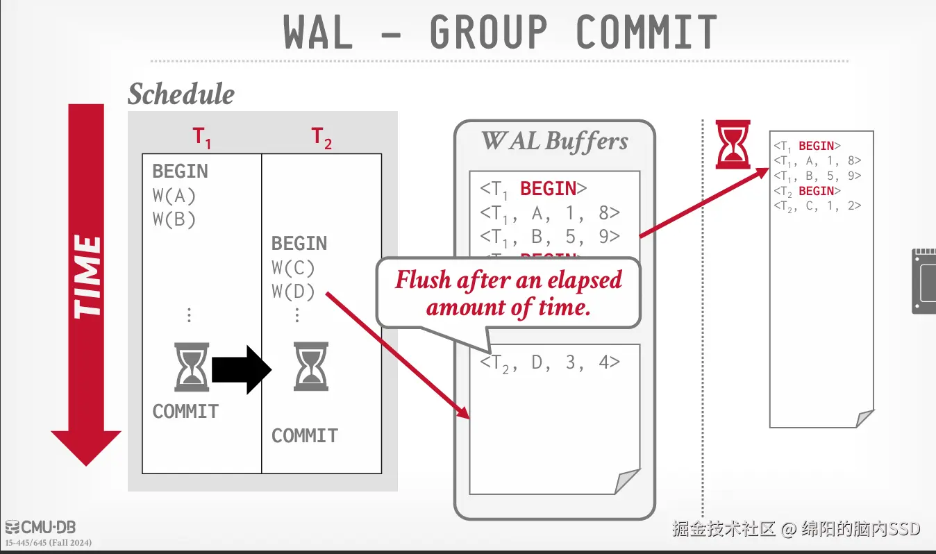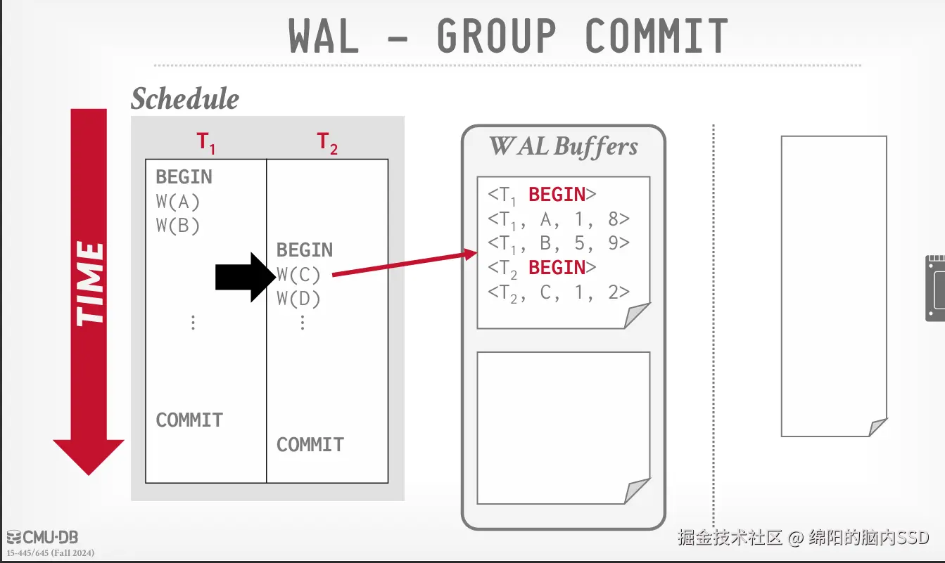 然后对于组提交, 组提交可以支持多个WAL Buffer。 同时设置一个系统时间,类似时间戳, 规定每超时一次时间戳, 那么就将WAL Buffer里面的数据写入一次磁盘。 同时, 如果WAL Buffer 被写满了, 也要写入磁盘。也就是不必等到COMMIT的时候才刷新到磁盘了。 同时多WAL Buffer, 比如双WAL Buffer。 类似双缓冲, 这样就可以轮流记录事务记录了。